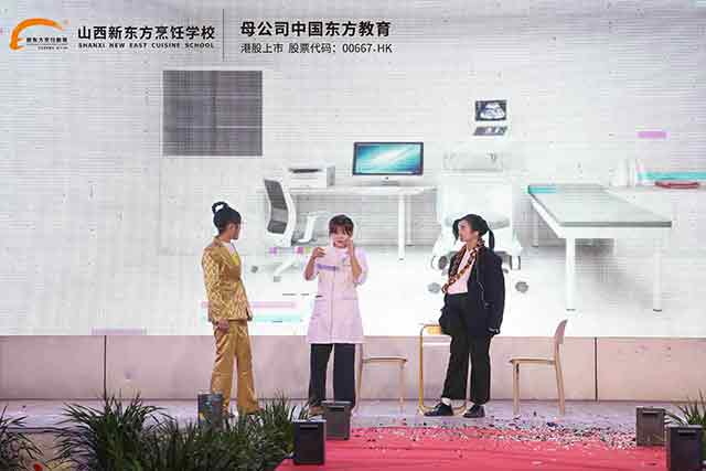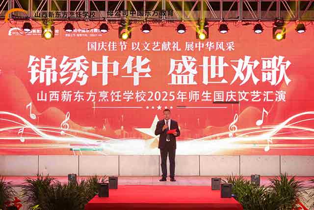 在全場期待的目光中,山西新東方烹飪學校校長于曉曦走上舞臺,宣布文藝晚會正式開始。致辭中,于校長深情回顧了學校在技能人才培養(yǎng)道路上的初心堅守與豐碩成果,從烹飪技藝的薪火相傳到現(xiàn)代職教理念的創(chuàng)新實踐,每一步都凝聚著對“培養(yǎng)高素質(zhì)技能人才”的執(zhí)著追求。她寄語全體師生,要以雙節(jié)為契機,既要深耕專業(yè)領(lǐng)域、錘煉過硬技能,更要傳承中華優(yōu)秀傳統(tǒng)文化,將個人成長與祖國發(fā)展緊密相連,讓青春在為國家貢獻、為行業(yè)賦能中綻放光彩。溫暖而莊重的話語,為整場晚會奠定了家國同心的情感基調(diào)。
