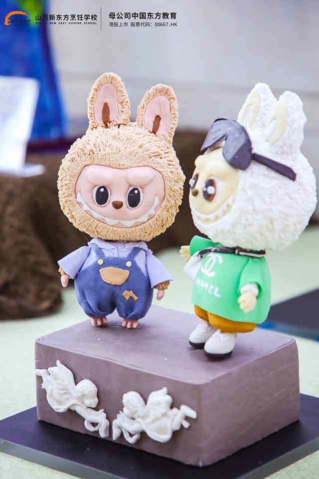 翻糖蛋糕區(qū)則把西點(diǎn)的“觀賞性”與“潮流感”拉滿,系列“拉布布”主題作品成為全場(chǎng)焦點(diǎn)。雪白糖膏塑出的圓潤(rùn)耳朵、蓬松裙擺自帶萌態(tài),粉色糖霜勾勒的腮紅與蝴蝶結(jié)細(xì)膩傳神,連拉布布爪子上的絨毛紋理都清晰可見(jiàn),靈動(dòng)得仿佛下一秒就要跳出展臺(tái)。這般巧思并非偶然,學(xué)校翻糖專項(xiàng)課程構(gòu)建了從基礎(chǔ)到高階的完整培養(yǎng)體系:從糖膏調(diào)制、基礎(chǔ)塑形的扎實(shí)訓(xùn)練,到角色設(shè)計(jì)、細(xì)節(jié)雕刻的進(jìn)階學(xué)習(xí),更緊跟市場(chǎng)趨勢(shì)引入IP聯(lián)名理念,讓學(xué)子的作品既具藝術(shù)質(zhì)感,又能精準(zhǔn)戳中當(dāng)下消費(fèi)者的審美偏好,自帶話題熱度。