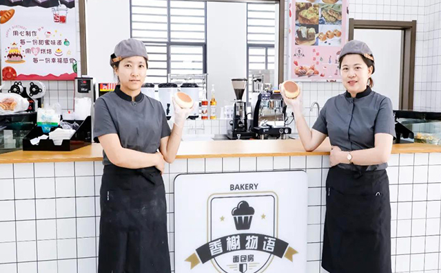 在一所中學的圖書館一樓,坐落著一家名為“香榭物語”的咖啡甜品店。店主鄒學明和楊瓊都是專業(yè)的畢業(yè)生,因為源于對烘焙甜品和咖啡飲品的喜愛,他們選擇一起合伙開了這家店。