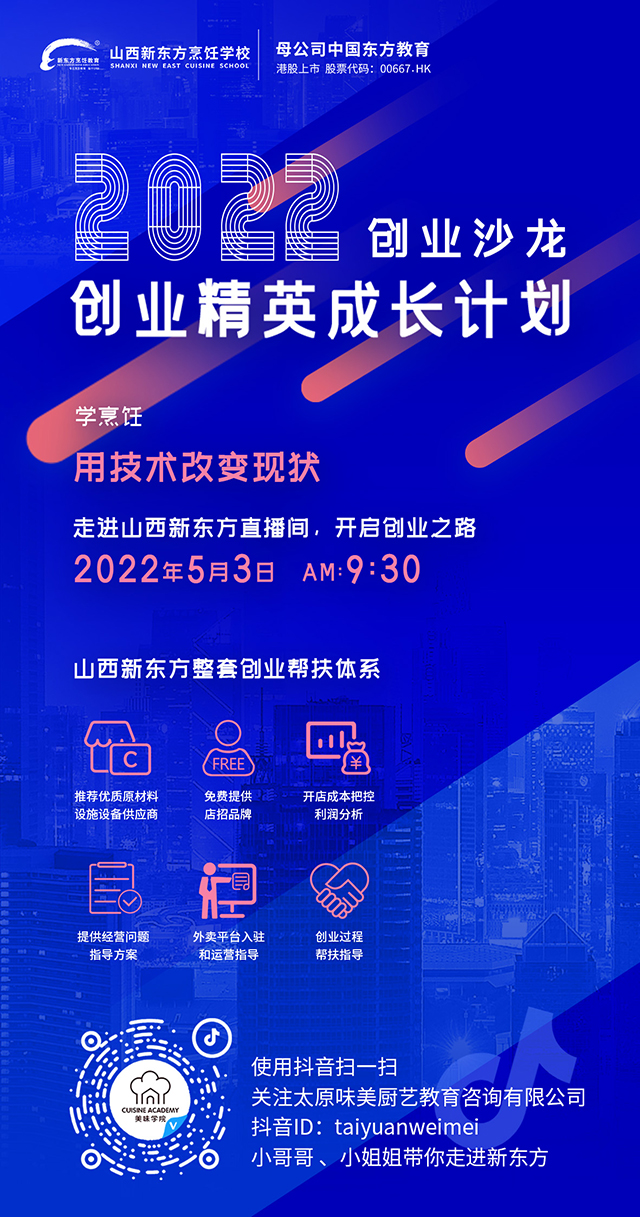 為了讓想創(chuàng)業(yè)的你更深地了解,山西新東方的師資及學(xué)習(xí)氛圍。5月3日,學(xué)校平陽校區(qū)特舉辦創(chuàng)業(yè)美食沙龍。如果你對“吃”文化有相當(dāng)?shù)恼J(rèn)可,如果你正在考察美食項(xiàng)目,如果你有創(chuàng)業(yè)的想法,一定不要錯(cuò)過此次【創(chuàng)業(yè)沙龍】。