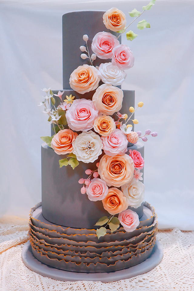 看著一朵朵色彩艷麗的糖花,陣陣糖香撲鼻而來(lái),如畫一般的造型,色彩的平衡,精美的飾品,充分體現(xiàn)了個(gè)性與藝術(shù)的完美結(jié)合,一件完美的翻糖蛋糕不僅要求翻糖師有精湛的工藝,獨(dú)立設(shè)計(jì)造型的能力,更是離不開翻糖師的匠心營(yíng)造,制作翻糖蛋糕的每一個(gè)環(huán)節(jié),都飽含著翻糖師傾注的心血,以及想傳遞給他人的甜蜜夢(mèng)想。